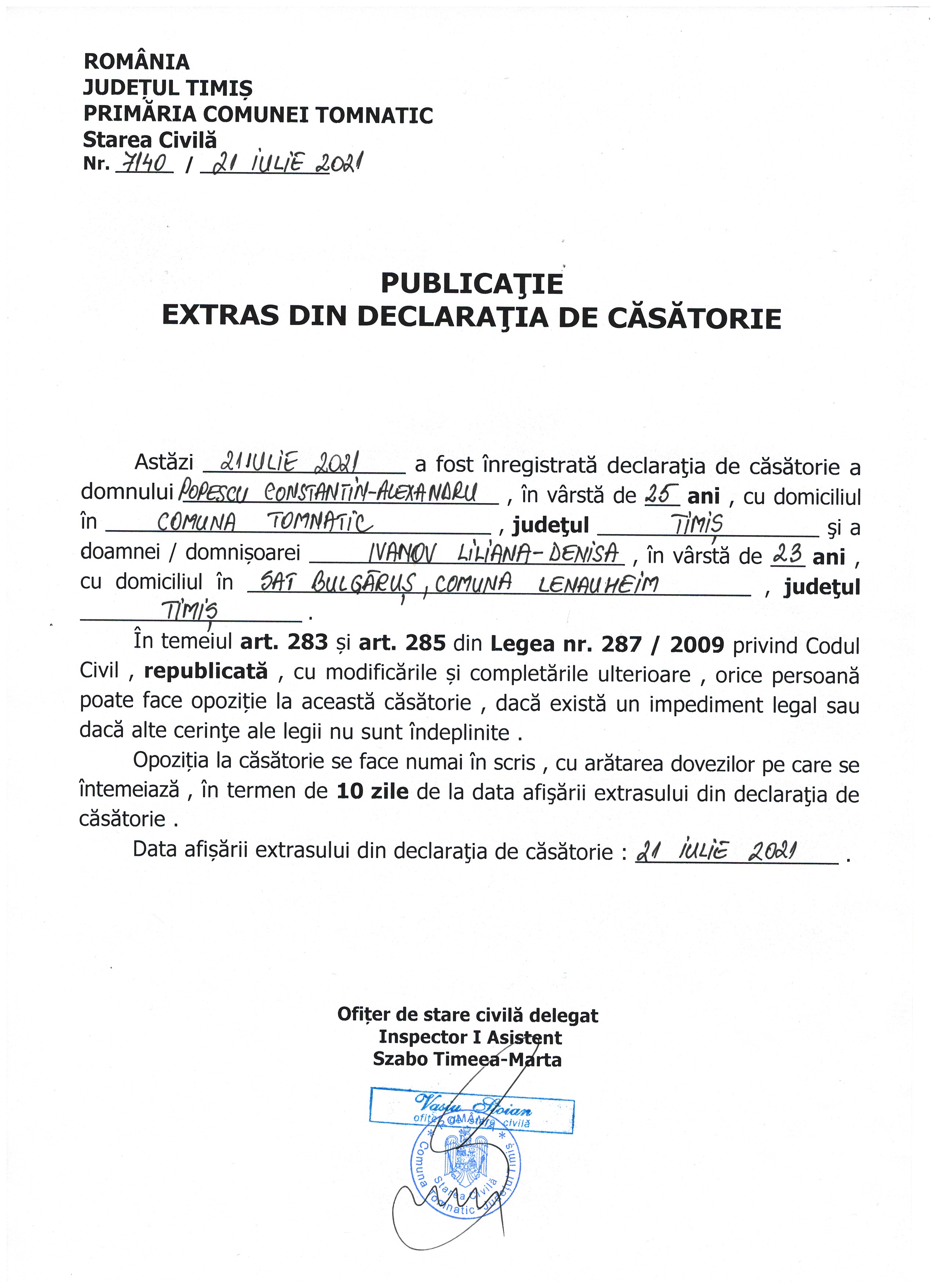 - 13. PUBLICATIE EXTRAS DIN DECLARATIA DE CASATORIE ,,POPESCU CONSTANTIN-ALEXANDRU/IVANOV LILIANA-DENISA”