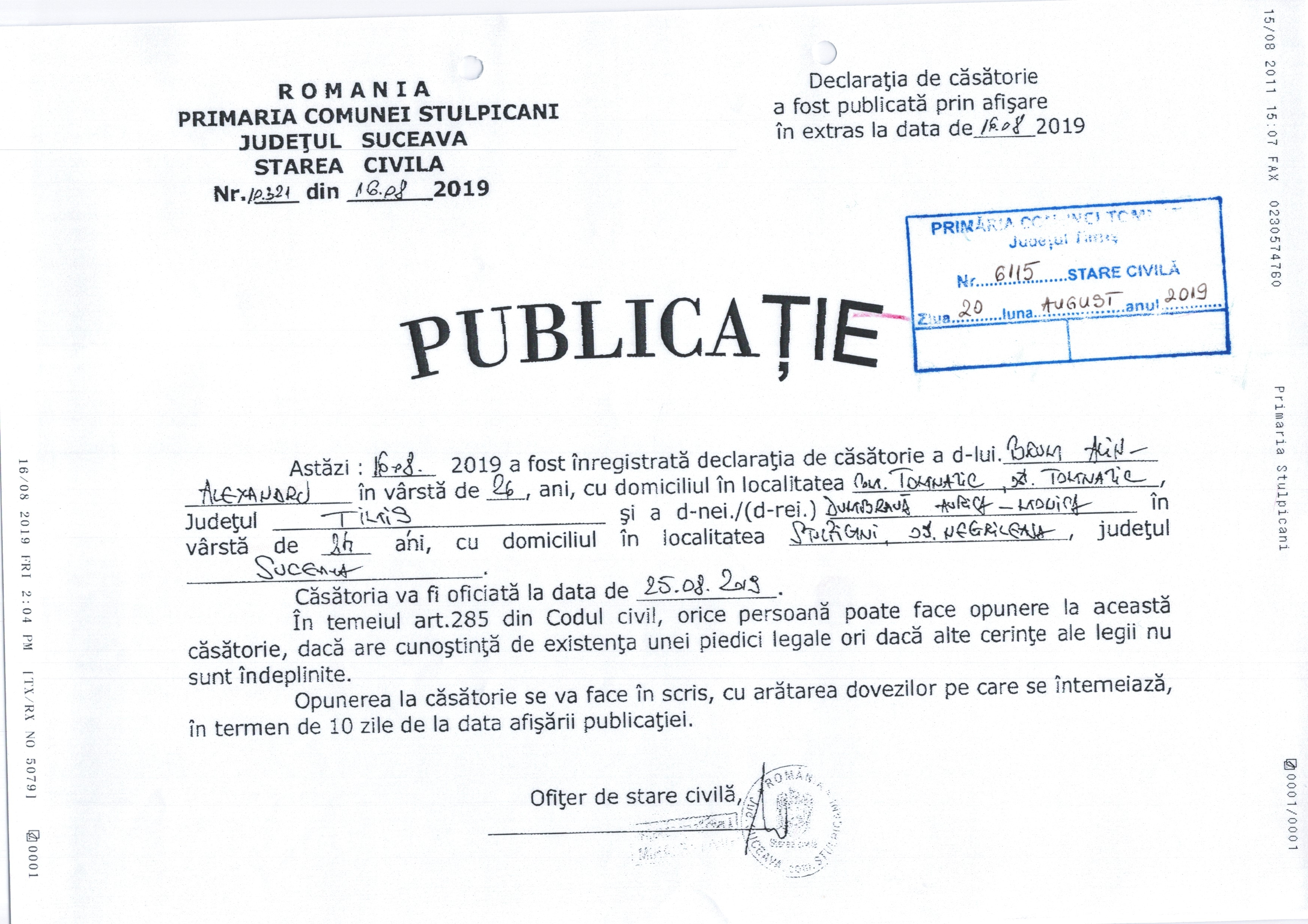 - 13. PUBLICAȚIE DIN DECLARAȚIA DE CĂSĂTORIE ,, TODOSI VASILE-ȘTEFAN / AȘTEFANIEI DANIELA,,
