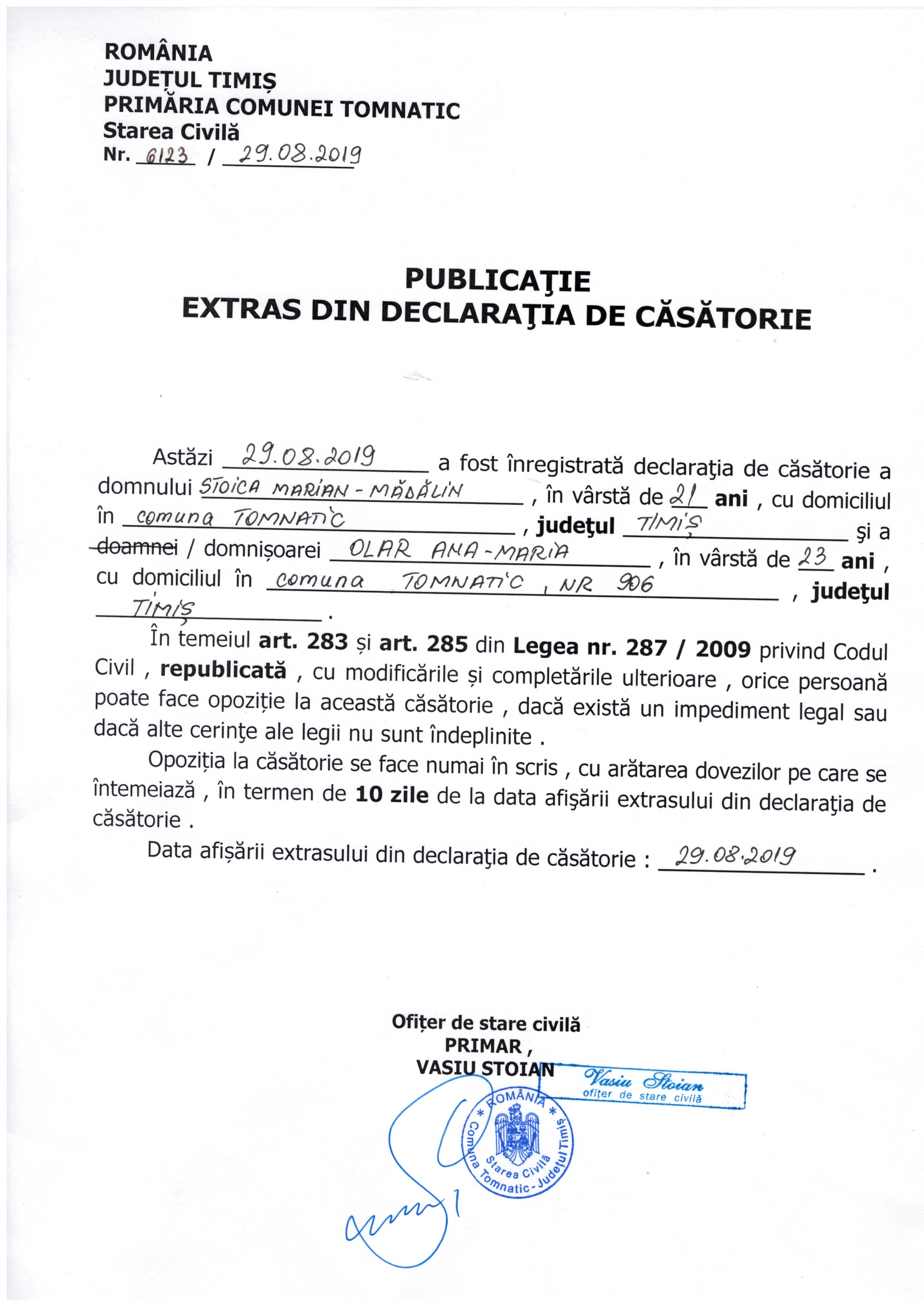 - PUBLICAȚIE EXTRAS DIN DECLARAȚIA DE CĂSĂTORIE – STOICA MARIAN-MĂDĂLIN / OLAR ANA-MARIA